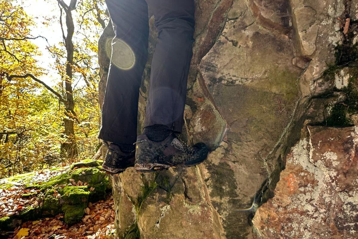 Dal jsem jim, myslím, opravdu zabrat. Ve skalním terénu se nejvíc ukázal přínos lezecké špičky a směsi Vibram MegaGrip. Na hladké skále držely fakticky dobře. Špička se dala přesně umístit na malé stupy – a když člověk potřeboval „edgovat“, boty se na nohou nezhroutily jako trailovky, na které jsem byl doteď zvyklý.